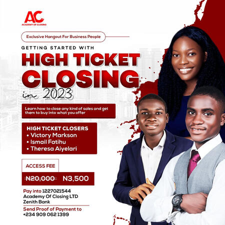 IS THIS YOUR SECRET PROBLEM?Do you freeze when you want to charge high for your products and services?Is it hard finding people who can really pay you what you are worth... ($2,000 or more)?You can't get high ticket clients to pay you without them giving you objections?It is not your fault!You simply did not have access to the right materials because it is not found on streets!And to make matters worsen... No school or college would dare show you how to solve these problems except...The Academy of Closing (Africa's Number #1 sales closing brand)This is why for the first time ever...The Academy has brought together 3 experts to guide you through practical and step by step guidelines to help you:👇👇👇